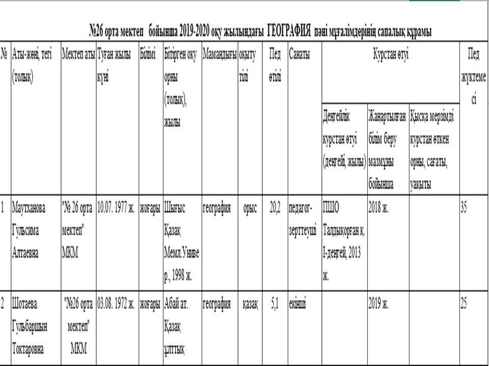 02 September 2019 0 1 2 3 4 5 About school №26 орта мектеп бойынша 2019-2020 оқу жылындағы ГЕОГРАФИЯ пәні мұғалімдерінің сапалық құрамы