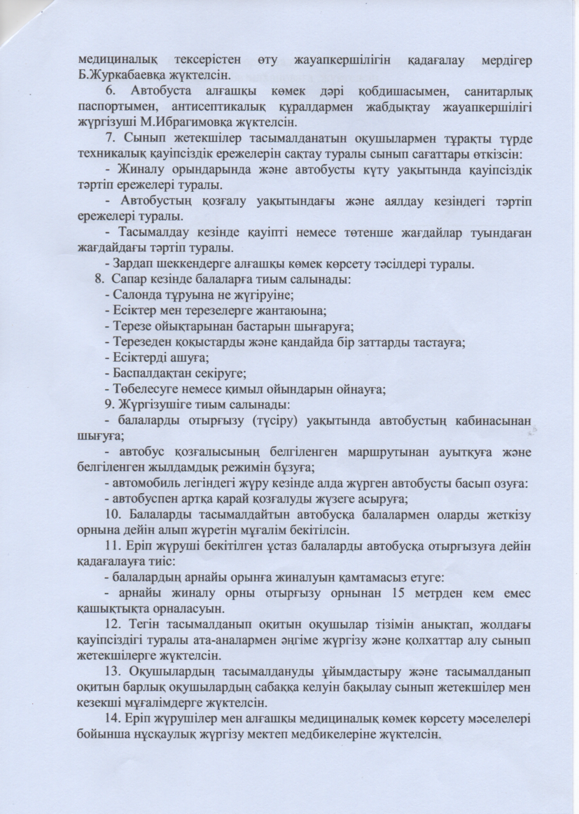 2023-2024 оқу жылында оқушыларды тегін тасымалды ұйымдастыру бойынша аудандық бұйрық негізінде мектепішілік бұйрық шығарылып, жауапты маман бекітілді. Биылғы жылы Простор, Финансист саяжайларынан 163 бала тасымалданады. Мұғалімдердің кезекшілік кестесі, әкімшіліктің кезекшілік кестесі құрылып, бекітілді.
