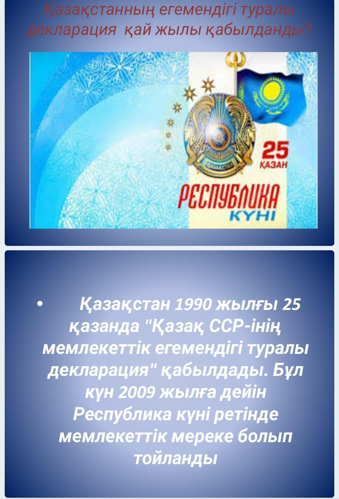 Қазақстан 1990 жылы 25 қазанда "Қазақстан ССР - інің мемлекеттік егемендігі туралы декларация " қабылдады. Бұл күн 2009 жылға дейін Республика күні ретінде мемлекеттік мереке болып тойланды. » "№26 ОРТА МЕКТЕБІ" МКМ