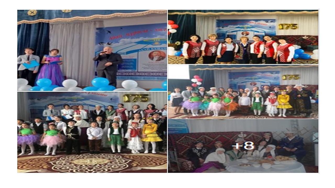 Мектебімізде Абай Құнанбайұлының 175 жылдық мерейтойына орай қазақ тілі мен әдебиет пәні мұалімдері кеш ұйымдастырды. Кеш барысында абай атамыздың өмірбаянынан, аудармаларынан, қара сөздерінен көріністер қойып, өлең жолдарын оқып, әндерін шырқады. Мектеп басшысы құттықтау сөз сөйлеп,оқушыларға ой салды. Қазақ тілі пәні ұстаздары мектеп кітапханасына Абай атамыздың кітаптарын тарту етті.