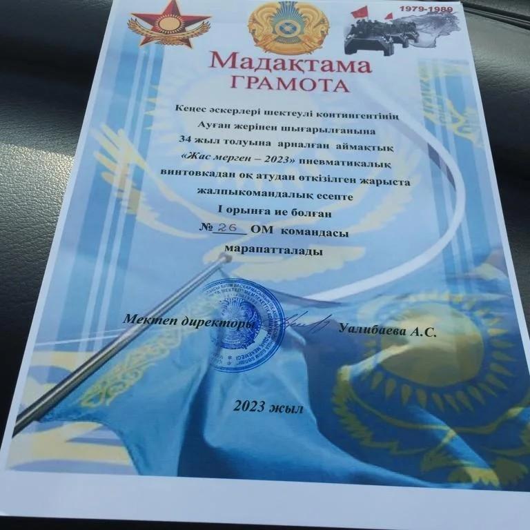 №26 ОРТА МЕКТЕП » Біз туралы » Жетістіктеріміз » Н. Тілендиевауылы N26 орта мектебі "Жас мерген-2023" пневматикалық винтовкадан оқ атудан өткізілген жарыстан 1-орынды иеленді. Ауданға жолдама алды.