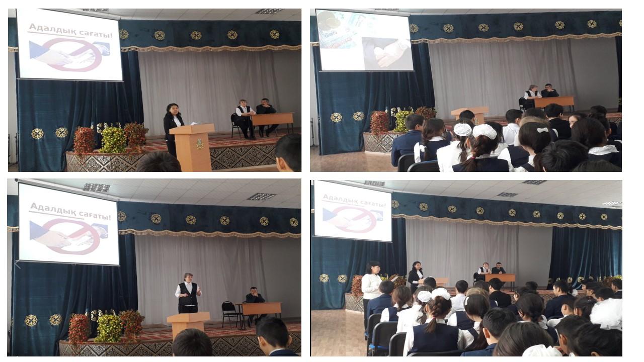 Мектебімізде 17 - қі ҚР сыбайлас жемқорлыққа қарсы іс- қимыл агенттігінің сыбайлас жемқорлыққа қарсы қызметі Алматы облысы бойынша департаментінің хаты негізінде жоғары сынып оқушыларына ардагер ұстаздардың қатысуымен "Адалдық сағаты" ұйымдастырылды.аңтар күн Адалдық сағатында сыбайлас жемқорлыққа жол бермеу туралы ойларын еркін айтып, пікірлерін білдірді. Ардагер ұстаздар оқушыларға өз ақыл-кеңестерін беріп, болашаққа дұрыс жол сілтеді. Тарих пәнінің мұғалімдері толық мәліметтер беріп кетті.