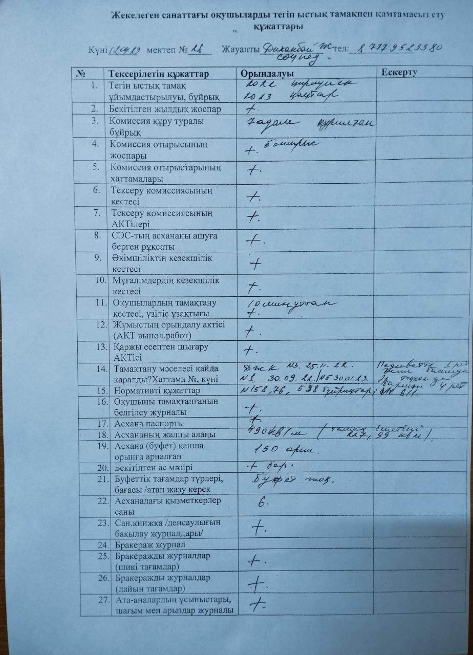 Іле ауданы бойынша №264 бұйрық негізінде 2023 жылдың 12-сәуір күні №26 орта мектептің мектеп асханасын және оқушыларды тамақтандыру жұмыстары бойынша зерделеу тексерілді. Зерделеу нәтижесінде біздің мектепте ешқандай минус шықпады. » "№26 ОРТА МЕКТЕБІ" МКМ