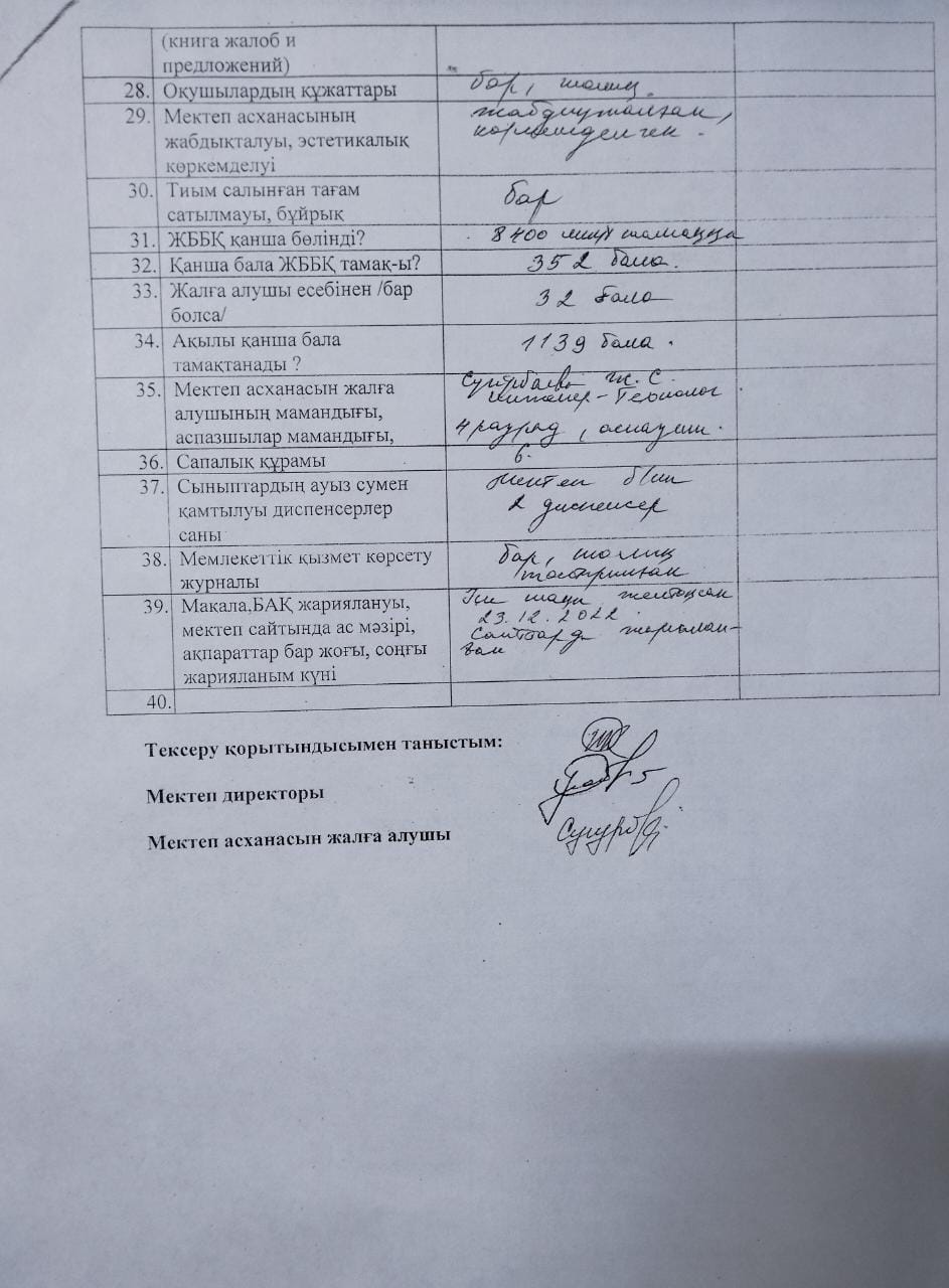 №26 ОРТА МЕКТЕП » Тамақтандыру » Іле ауданы бойынша №264 бұйрық негізінде 2023 жылдың 12-сәуір күні №26 орта мектептің мектеп асханасын және оқушыларды тамақтандыру жұмыстары бойынша зерделеу тексерілді. Зерделеу нәтижесінде біздің мектепте ешқандай минус шықпады.